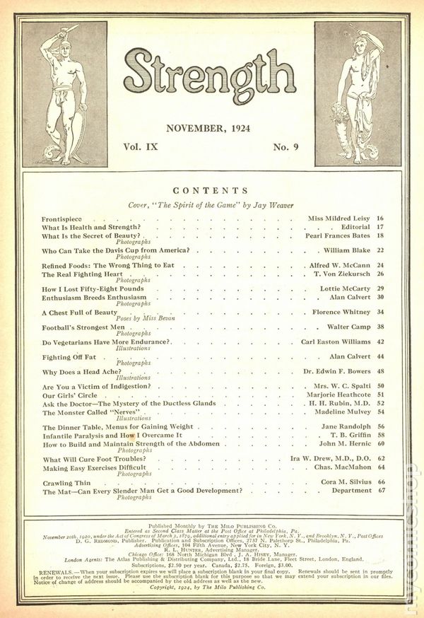Vol. 9, No. 9. November 1924. Jay Weaver cover. One of the earliest strength-training magazines in the US, published by Alan Calvert. 8.5" x 11.5". 96 pages. B&W. Cover price $0.25.
