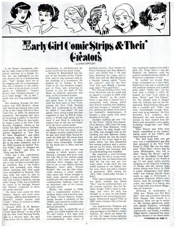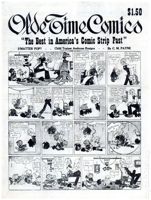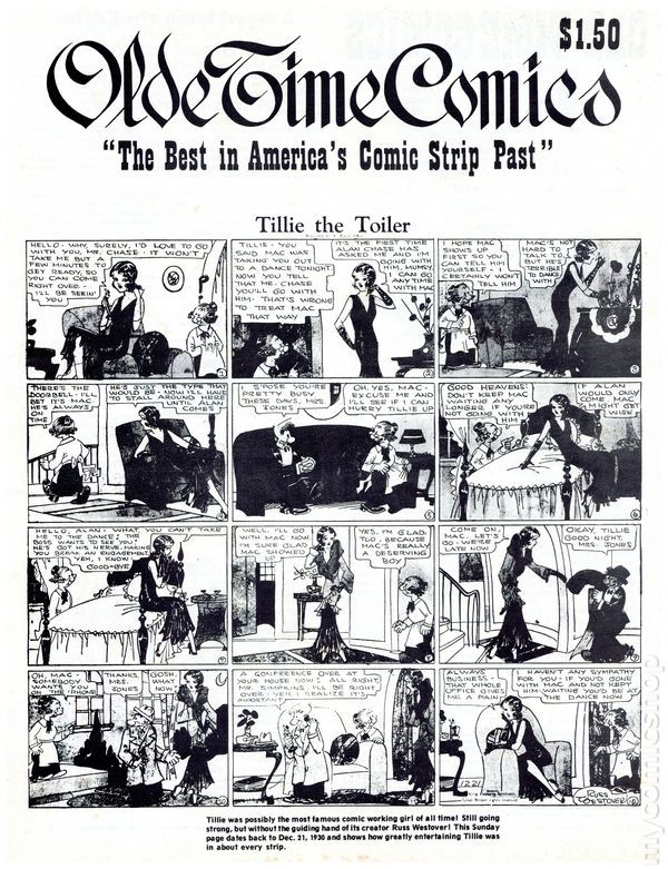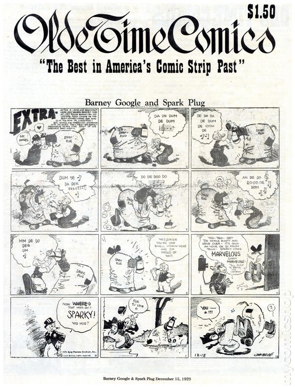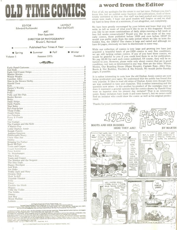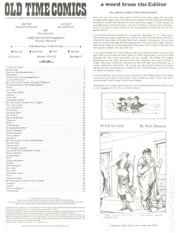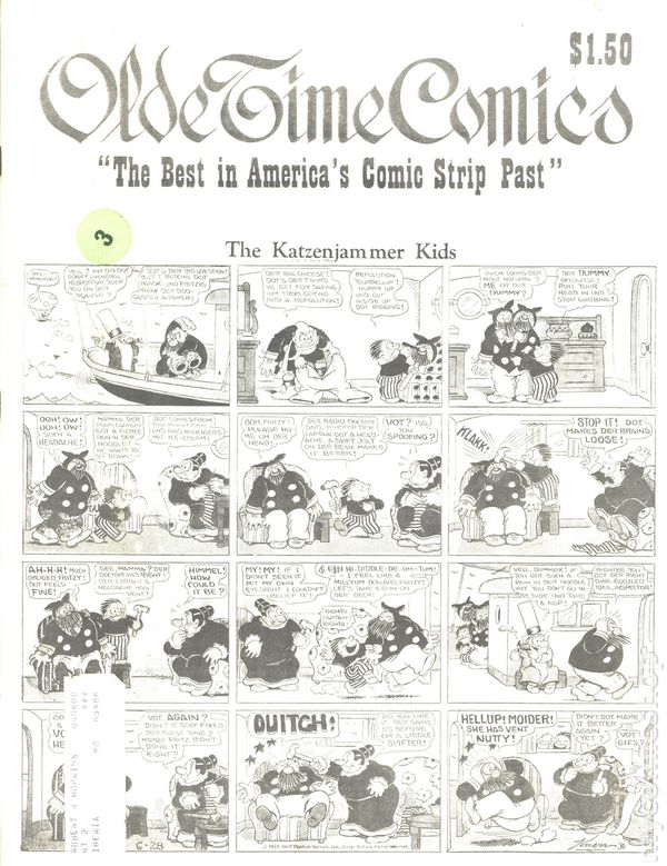 Fall 1975. Newspaper sized series appreciating the early days of American comics. Article feature: The Yarns of C. W. Kahles. Comics include: The Katzenjammer Kids, The King of the Pollywogs, Clarence The Cop, Hairbreadth Harry, Clumsy Claude, Our Friend Mush, Elmer, Say Pop, Buster Brown, Just Boy, Charlie Plumb, Orphan Annie, C. A. Voight, Betty, Polly & Her Pals, Pa's Son-In-Law, Daily Strips, Felix The Cat, Nize Baby, Reg'lar Fellers, Bringing Up Father, Gasoline Alley, High-Gear Homer, Teddy Jack and Mary, Tillie the Toiler, Mamma's Angel Child, Harold Teen, Slim Jim and the Force, Joe Palooka, Uncle Wiggily's Adventures, School Days, Little Nemo in Slumberland, Girls, Apple Mary, Paul Robinson, Texas Slim, Mr. George & Dear Wifey, Joe Jinks, Cicero Sapp, The Bungle Family, Blondie, Thimble Theater, Toots 'N Casper, Fritzi Ritz, Phil Fumble, Clarence, Mickey Mouse, Dem Boys, Mr. Straphanger, Perry & Freddie, Mr. & Mrs., Hawkshaw the Detective, Moon Mullins, and Clumsy Claude. Cover price $1.50.