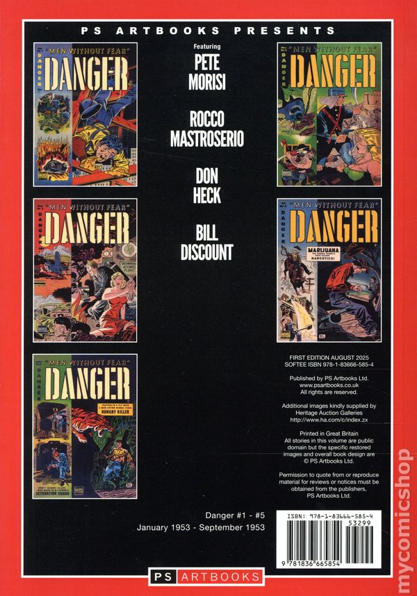 Volume 9 - 1st printing. "Danger: January 1953-September 1953!" Collects Danger (1952 Comic Media) #1-5. Cover by Pete Morisi. Johnny Dynamite, created by Pete Morisi, was a hard-boiled private detective, known as "The Wild Man from Chicago." Good friends with the D.A. but readily accepted by the underworld, he smoked cigarettes constantly, cursed frequently and had a bad habit of getting shot and beaten by his enemies. But always gave as good as he got; he was an experienced and persistent detective taking his cases very personally and killed many of his early foes, claiming they were reaching for a weapon. Myra Benz, who had shot him in the eye, was brazenly killed without any true justification beyond his own sense of justice. Featuring Stories by Pete Morisii, Edwin Green, Ross Andru, Mike Esposito, Vic Evans, and Don Heck. Softcover, 184 pages, full color. Cover price $32.99.
