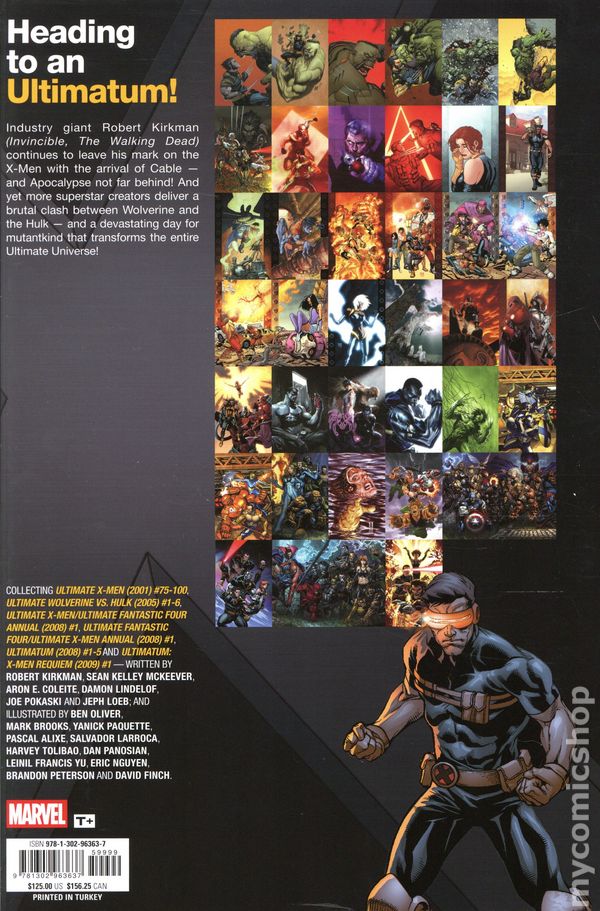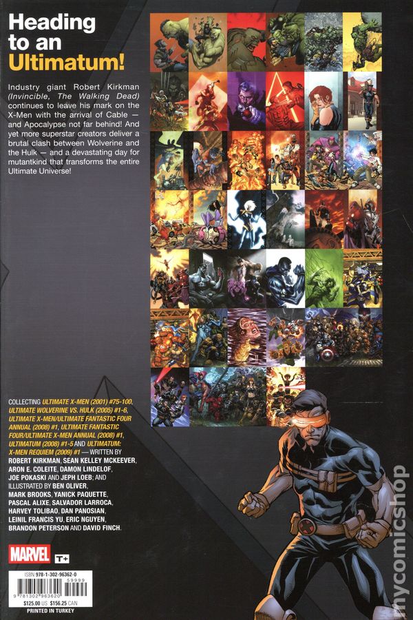 Volume 3 - 1st printing. Collects Ultimate X-Men (2001-2009 1st Series) #75-100, Ultimate Wolverine vs. Hulk (2006) 1-6, Ultimate X-Men/Ultimate Fantastic Four Annual (2008) 1, Ultimate Fantastic Four/Ultimate X-Men Annual (2008) 1, Ultimatum (2008 Marvel) #1-5, and Ultimatum: X-Men Requiem (2009). Written by Damon Lindelof, Robert Kirkman, Sean Kelley McKeever, Aron E. Coleite, Joe Pokaski, and Jeph Loeb. Art by Leinil Francis Yu, Ben Oliver, Pat Davidson, Mark Brooks, Jaime Mendoza, Yanick Paquette, Salvador Larroca, Serge LaPointe, Karl Story, Kris Justice, Pascal Alixe, Danny Miki, Victor Olazaba, Allen Martinez, Harvey Tolibao, Brandon Peterson, Troy Hubbs, Clay Mann, Carlos Cuevas, Dan Panosian, Eric Nguyen, and David Finch. Cover by Michael Turner. Industry giant Robert Kirkman (Invincible, The Walking Dead) leaves his mark on the Ultimate X-Men! If one man is capable of disrupting the carefully controlled world of Charles Xaviers School for Gifted Youngsters, its Ultimate Cable! He comes from a tragic future, and his sinister secrets will shock the X-Men to their very core. Hes not the only refugee from tomorrow here today: Bishop is completing his own team of mutants, ready to carry on Charles Xaviers legacy. Youll never guess who the new Ultimate X-Men are! But dark times are ahead as the evolutionary emperor known as Apocalypse arrives — and two more monstrous threats, who look eerily like Stryfe and Onslaught, rear their ugly heads! Plus: The X-Men are on a collision course with the Fantastic Four! And the end is nigh as Ultimatum strikes and a tidal wave sweeps through New York City — and Magneto is to blame! Hardcover, 8 1/2-in. x 11-in., 1,088 pages, full color. Rated T Cover price $125.00.