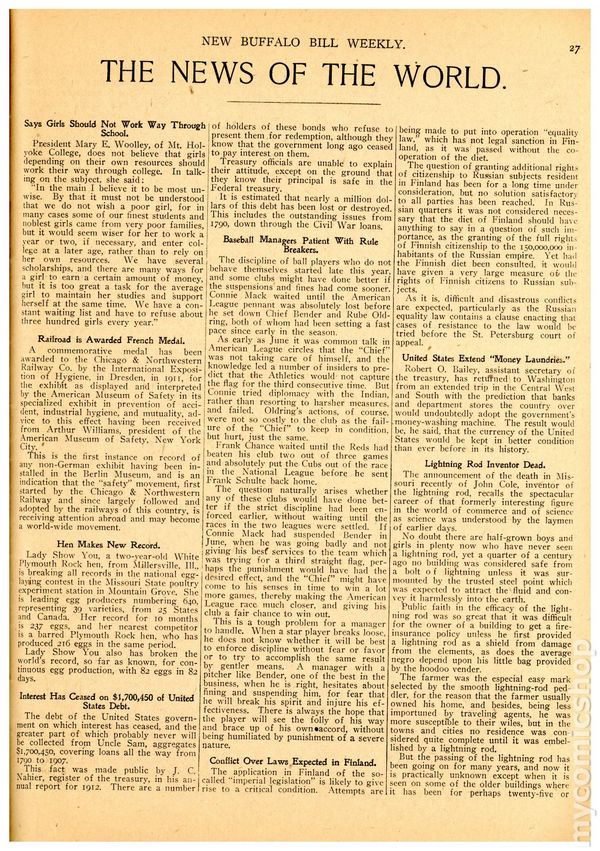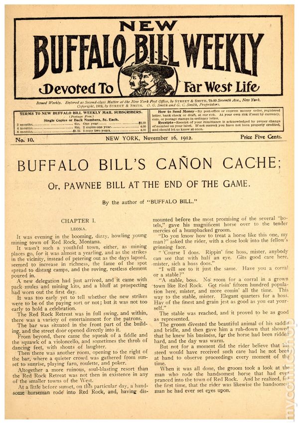 November 16, 1912. Buffalo Bill's Canyon Cache; or, Pawnee Bill at the End of the Game - by Earnest A. Young. Cover price $0.05.