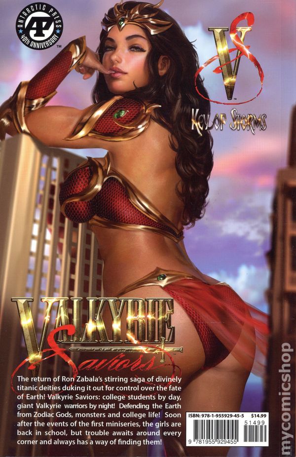 Volume 2 - 1st printing. Collects Valkyrie Saviors: Key of Storms (2023 Antarctic Press) #1-3. Written by Ron Z. Art by Donny Hadiwidjaja and AR Molina. Cover by KD Chan. The return of Ron Zabalas stirring saga of divinely titanic deities duking it out for control over the fate of Earth! Valkyrie Saviors: college students by day, giant Valkyrie warriors by night! Defending the Earth from Zodiac Gods, monsters and college life! Soon after the events of the first miniseries, the girls are back in school, but trouble awaits around every corner and always has a way of finding them! Softcover, 64 pages, full color. Teen+ Cover price $14.99.
