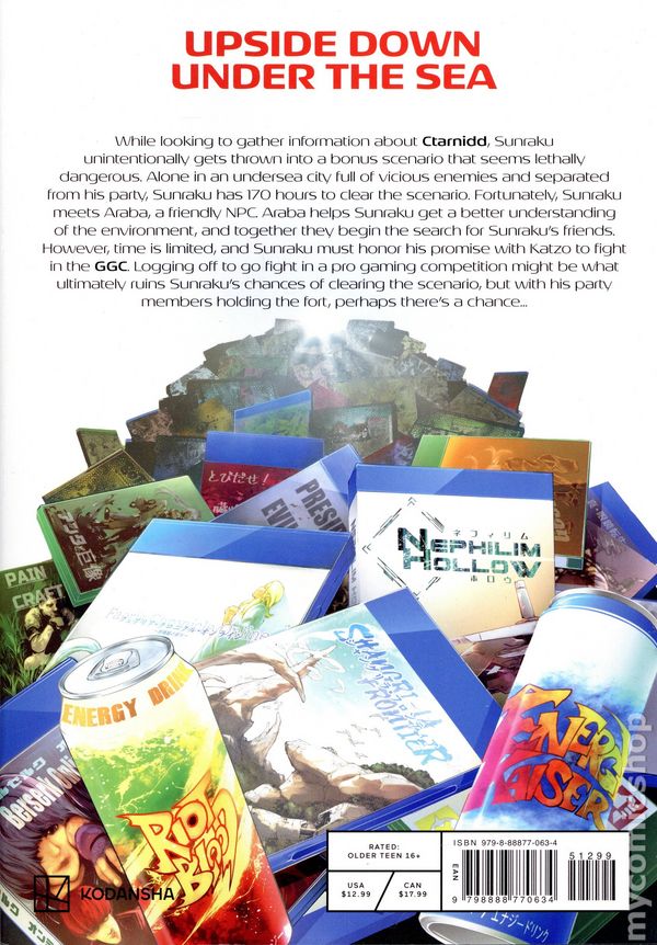 Volume 12 - 1st printing. Written by Katarina. Art and cover by Ryosuke Fuji. Translated by Kevin Gifford. While looking to gather information about Ctarnidd, Sunraku unintentionally gets thrown into a bonus scenario that seems lethally dangerous. Alone in an undersea city full of vicious enemies and separated from his party, Sunraku has 170 hours to clear the scenario. Fortunately, Sunraku meets Araba, a friendly NPC. Araba helps Sunraku get a better understanding of the environment and together they begin the search for Sunrakus friends. However, time is limited and Sunraku must honor his promise with Katzo to fight in the GGC. Logging off to go fight in a pro gaming competition might be what ultimately ruins Sunrakus chances of clearing the scenario, but with his party members holding the fort, perhaps theres a chance! Softcover, 5-in. x 7-in., 192 pages, B&W. Older Teen (16+) Cover price $12.99.