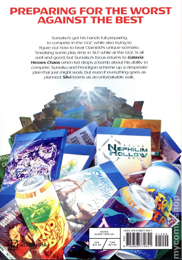 Volume 13 - 2nd and later printings. Written by Katarina. Art and cover by Ryosuke Fuji. Translated by Kevin Gifford. Sunrakus got his hands full preparing to compete in the GGC while also trying to figure out how to beat Ctarnidds unique scenario. Sneaking some play time in SLF while at the GGC is all well and good, but Sunrakus focus returns to Galaxia Heroes Chaos when Kei drops a bomb about his ability to compete. Sunraku and Pencilgon scheme up a desperate plan that just might work, but even if everything goes as planned, Silvi looms as an unbreakable wall! Softcover, 5-in. x 7-in., 192 pages, B&W. Older Teen (16+) Cover price $12.99.