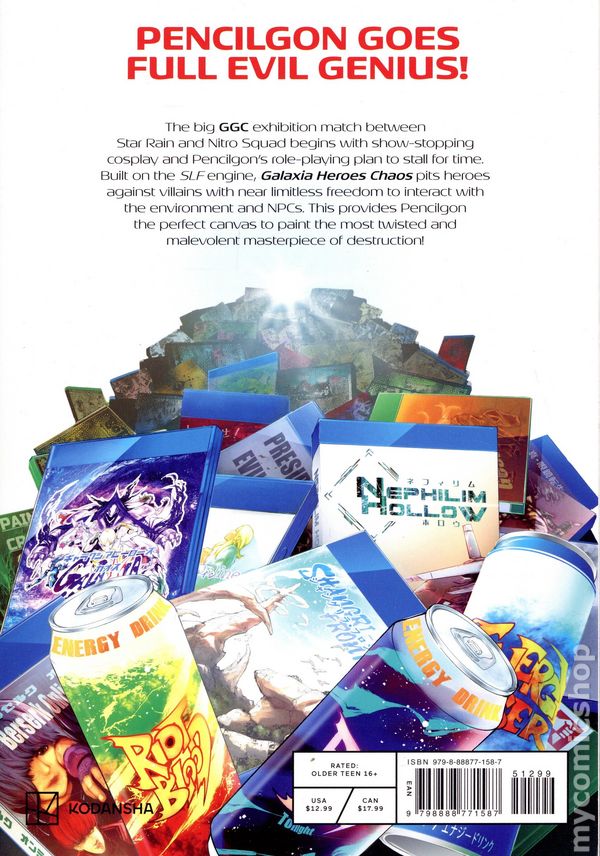 Volume 14 - 2nd and later printings. Written by Katarina. Art and cover by Ryosuke Fuji. Translated by Kevin Gifford. The big GGC exhibition match between Star Rain and Nitro Squad begins with show-stopping cosplay and Pencilgons role-playing plan to stall for time. Built on the SLF engine, Galaxia Heroes Chaos pits heroes against villains with near limitless freedom to interact with the environment and NPCs. This provides Pencilgon the perfect canvas to paint the most twisted and malevolent masterpiece of destruction! Softcover, 5-in. x 7-in., 192 pages, B&W. Older Teen (16+) Cover price $12.99.