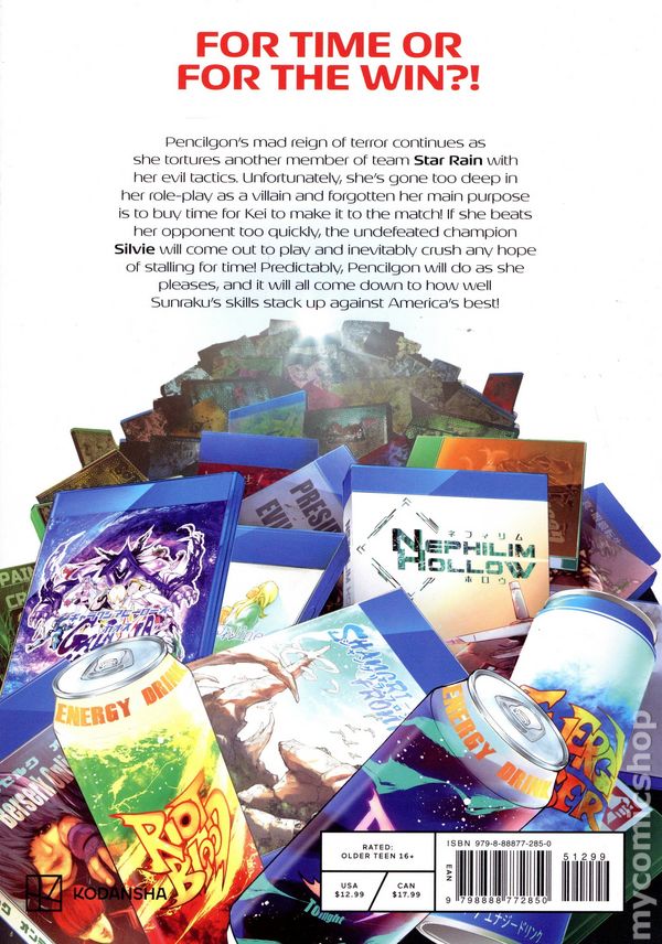 Volume 15 - 2nd and later printings. Written by Katarina. Art and cover by Ryosuke Fuji. Translated by Kevin Gifford. Pencilgons mad reign of terror continues as she tortures another member of team Star Rain with her evil tactics. Unfortunately, shes gone too deep in her role-play as a villain and forgotten her main purpose is to buy time for Kei to make it to the match! If she beats her opponent too quickly, the undefeated champion Silvi will come out to play and inevitably crush any hope of stalling for time! Predictably, Pencilgon will do as she pleases, and it will all come down to how well Sunrakus skills stack up against Americas best! Softcover, 5-in. x 7-in., 192 pages, B&W. Older Teen (16+) Cover price $12.99.