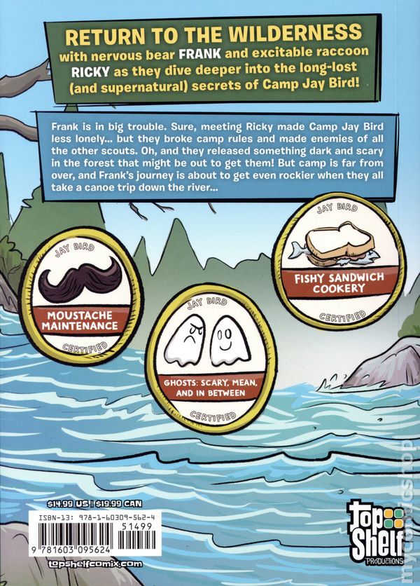 Volume 2 - 1st printing. "The River Rises!" Story and art by Jonathan Schnapp. Calling all comics-loving campers! Return to the wilderness with nervous bear Frank and excitable raccoon Ricky as they dive deeper into the long-lost (and supernatural) secrets of Camp Jay Bird. Frank is in big trouble. Sure, meeting Ricky made Camp Jay Bird less lonely…but they broke camp rules and made enemies of all the other scouts. Oh, and they released something dark and scary in the forest that might be out to get them! But camp is far from over, and Frank's journey is about to get even rockier when they all take a canoe trip down the river. Add in a friendly ghost, a secret stash, and a half-empty journal, and Frank is well on his way to meeting the Order of the Night Jay. Softcover, 6-in. x 8-in., 168 pages, full color. All Ages Cover price $14.95.