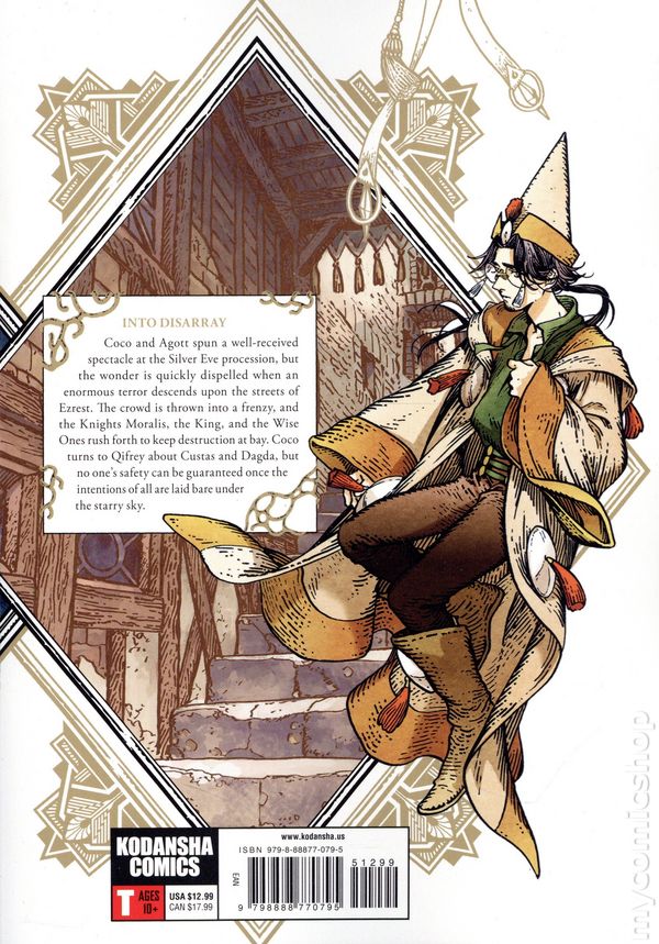 Volume 12 - 2nd and later printings. Story and art by Kamome Shirahama. Translated by Stephen Kohler. A beautifully-illustrated story about a girl who longs for magic in her life and learns that, on the inside, she already is what she wishes she could be. This lushly-drawn story has won an Eisner Award and a Harvey Award, and was voted one of the top 10 manga of the year in 2018 by the Japanese manga industry. INTO DISARRAY. Coco and Agott spun a well-received spectacle at the Silver Eve procession, but the wonder is quickly dispelled when an enormous terror descends upon the streets of Ezrest. The crowd is thrown into a frenzy, and the Knights Moralis, the King, and the Wise Ones rush forth to keep destruction at bay. Coco turns to Qifrey about Custas and Dagda, but no ones safety can be guaranteed once the intentions of all are laid bare under the starry sky. Softcover, 6-in. x 8-in., 192 pages, B&W. Rated T Cover price $12.99.