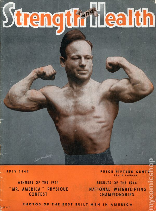 July 1944. Dick Bachtell Photo Cover. Strength & Health was one of the earliest magazines devoted to fitness and bodybuilding. Features photos of various physiques, instructional illustrations of exercises, and articles focusing on fitness. Through the early 1960s, it was the most popular weightlifting magazine in the United States. 8 1/2" X 11 1/2". 52 pages. Cover price $0.15.