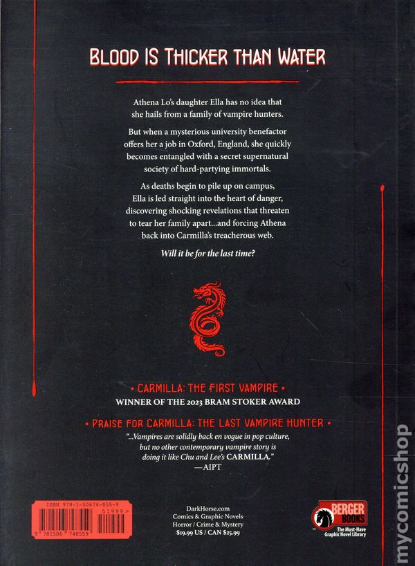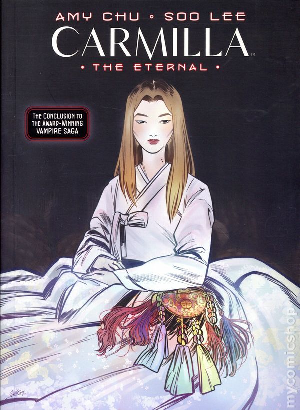 Volume 3 - 1st printing. "The Eternal!" Written by Amy Chu. Art and cover by Soo Lee. The final chapter of this Bram Stoker Award-winning graphic novel reimagination of Sheridan LeFanu's classic Carmilla! Athena's daughter Ella journeys to Oxford, England where a mysterious university benefactor hires her for what seems like a simple research position, but leads her straight into the heart of danger... and the Lo family back into the complicated web of Carmilla herself. As deaths begin to pile up on campus, Ella becomes entangled with a secret supernatural society of hard partying immortals. And just as Athena once did, Ella is about to discover some family secrets of her own... Softcover, 6-in. x 9-in., 112 pages, full color. Mature Readers Cover price $19.99.