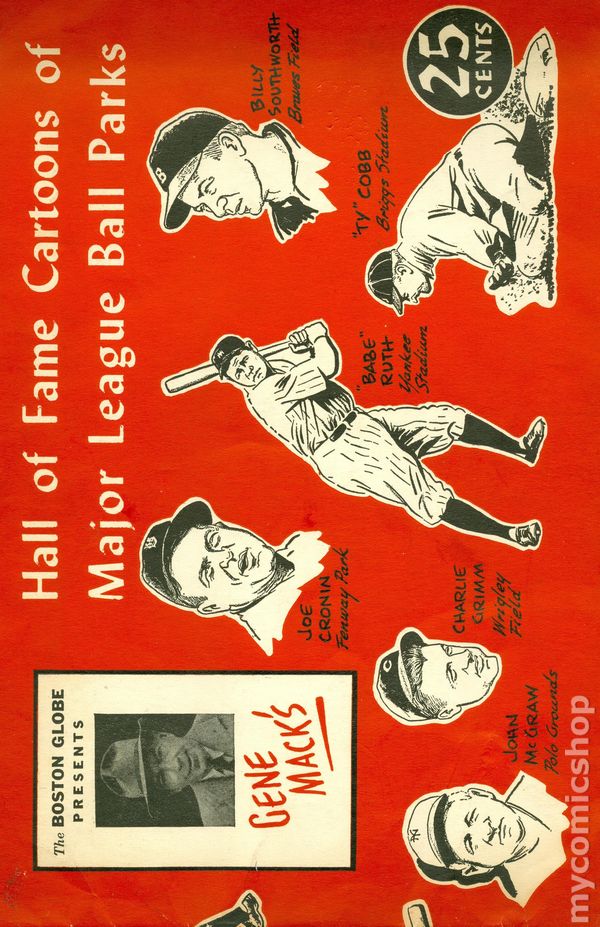 Gene Mack's Hall of Fame Cartoons, Major League Ball Parks (1947). Gene Mack began his career as cartoonist for the sports pages of the Boston Globe in 1915. The cartoons in this collection depict Major League ball parks and famous players of the era. Accompanying each full page cartoon is a page of text featuring a little history and a description of the field pictured. The back cover features drawings by Mack of baseball luminaries such as Honus Wagner, Ty Cobb, Babe Ruth, Connie Mack (Gene's cousin), Ted Williams, and more. This collection was published in 1947. A nice collector's item for baseball fans. Black and white, 36 pages, 50c cover price. 11 in. x 7 in. Cover price $0.25.