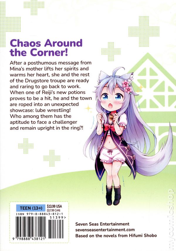 Volume 9 - 1st printing. Written by Kennoji. Art and Cover by Eri Haruno. Character Design by Matsuuni. Translated by Ben Trethewey. Adapted by David Lumsdon. CHAOS AROUND THE CORNER! After a posthumous message from Minas mother lifts her spirits and warms her heart, she and the rest of the Drugstore troupe are ready and raring to go back to work. When one of Reijis new potions proves to be a hit, he and the town are roped into an unexpected showcase: lube wrestling! Who among them has the aptitude to face a challenger and remain upright in the ring?! Softcover, 5-in. x 7-in., 144 pages, B&W. Teen (13+) Cover price $13.99.