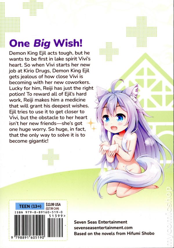 Volume 10 - 1st printing. Written by Kennoji. Art and Cover by Eri Haruno. Character Design by Matsuuni. Translated by Ben Trethewey. Adapted by David Lumsdon. ONE BIG WISH! Demon King Ejil acts tough, but he wants to be first in lake spirit Vivis heart. So when Vivi starts her new job at Kirio Drugs, Demon King Ejil gets jealous of how close Vivi is becoming with her new coworkers. Lucky for him, Reji has just the right potion! To reward all of Ejils hard work, Reiji makes him a medicine that will grant his deepest wishes. Ejil tries to use it to get closer to Vivi, but the obstacle to her heart isnt her new friends—shes got one huge worry. So huge, in fact, that the only way to solve it is to become gigantic! Softcover, 5-in. x 7-in., 144 pages, B&W. Teen (13+) Cover price $13.99.