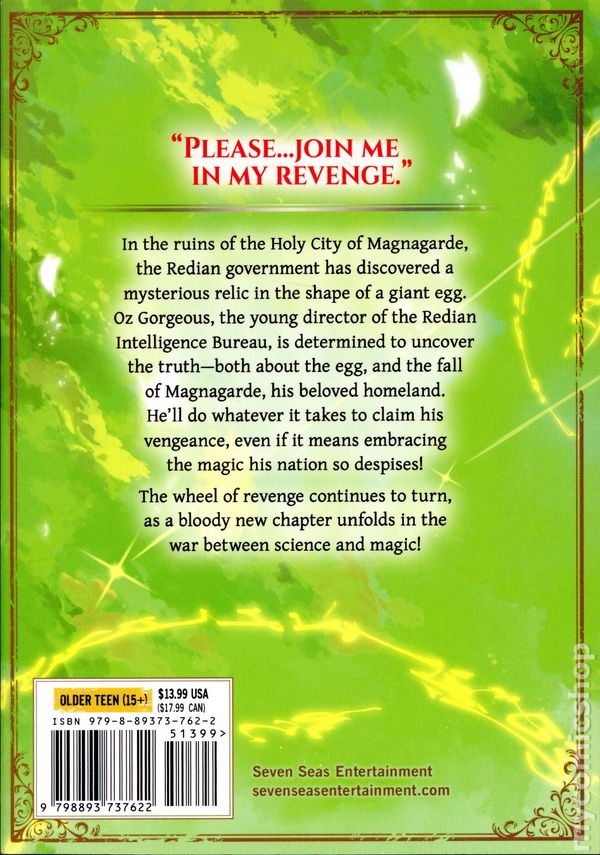 Volume 11 - 1st printing. Story and art by yoruhashi. Translated by Nan Rymaer. In the ruins of the Holy City of Magnagarde, the Redian government has discovered a mysterious relic in the shape of a giant egg. Oz Gorgeous, the young director of the Redian intelligence bureau, is determined to uncover the truthabout the egg, and the fall of Magnagarde, his beloved homeland. He'll do whatever it takes to claim his vengeance, even if it means embracing the magic his nation so despises! The wheel of revenge continues to turn, as a bloody new chapter unfolds in the war between science and magic! Softcover, 5-in. x 7-in., 170 pages, B&W. Older Teen (15+) Cover price $13.99.
