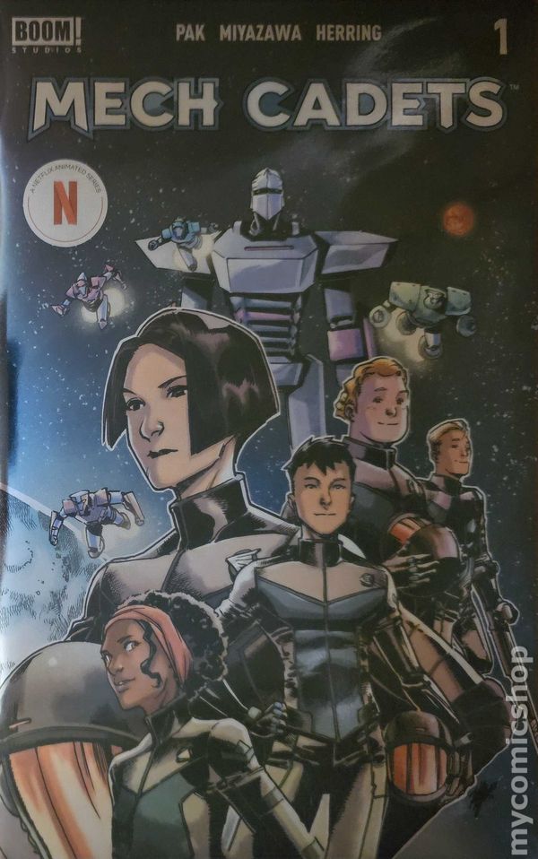 Written by Greg Pak. Art by Takeshi Miyazawa. Cover by Takeshi Miyazawa, Ian Herring. Fans of the highly anticipated Netflix series won't want to miss this perfect companion series by highly acclaimed writer Greg Pak (Star Wars: Darth Vader), superstar artist Takeshi Miyazawa (She-Hulk), and colorist Ian Herring (Spider-Man / Deadpool). General Park-head of Sky Corps Academy-must assemble a team of heroes to protect humankind from alien invasions, and Stanford Yu, Maya Sanchez, Frank Olivetti, and Park's own daughter Olivia may have been pulled into the role by fate... as they are Earth's best hope. But there is more to their relationships with the symbiotic, sentient giant Robos they pilot... and the alien threat of The Sharg is far more epic and widespread than any could imagine! While Mech Cadets makes a fresh debut for new readers and viewers, long-time fans can delight in having more adventures after the long awaited collection of Mech Cadets Book One! 32 pages, full color. Cover price $4.99.