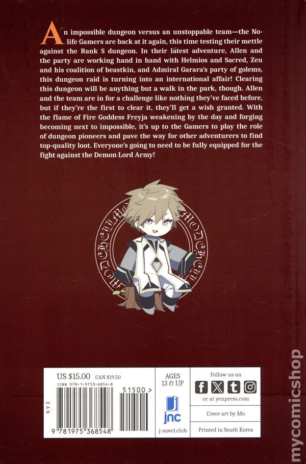 Volume 6 - 1st printing. Written by Hamuo. Art and cover by Mo. Translated by Taishi. An impossible dungeon versus an unstoppable team-the No-life Gamers are back at it again, this time testing their mettle against the Rank S dungeon. In their latest adventure, Allen and the party are working hand in hand with Helmios and Sacred, Zeu and his coalition of beastkin, and Admiral Garara's party of golems, this dungeon raid is turning into an international affair! Clearing this dungeon will be anything but a walk in the park, though. Allen and the team are in for a challenge like nothing they've faced before, but if they're the first to clear it, they'll get a wish granted. With the flame of Fire Goddess Freyja weakening by the day and forging becoming next to impossible, it's up to the Gamers to play the role of dungeon pioneers and pave the way for other adventurers to find top-quality loot. Everyone's going to need to be fully equipped for the fight against the Demon Lord Army! Softcover, 5-in. x 7-in., 226 pages, Text (with Chapter Illustrations). Cover price $15.00.