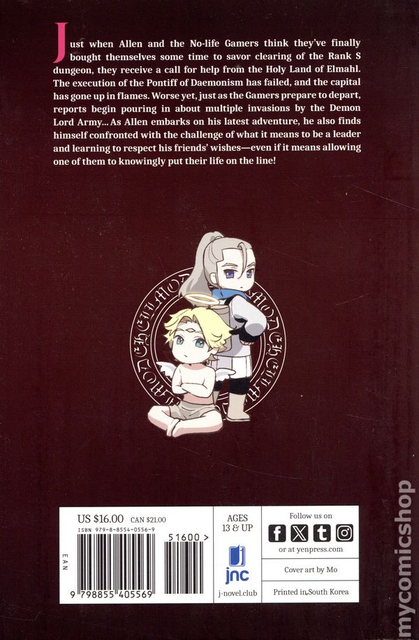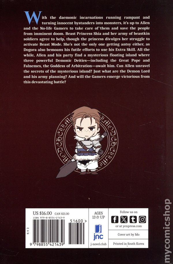 Volume 7 - 1st printing. Written by Hamuo. Art and cover by Mo. Translated by Taishi. Just when Allen and the No-life Gamers think they've finally bought themselves some time to savor clearing of the Rank S dungeon, they receive a call for help from the Holy Land of Elmahl. The execution of the Pontiff of Daemonism has failed, and the capital has gone up in flames. Worse yet, just as the Gamers prepare to depart, reports begin pouring in about multiple invasions by the Demon Lord Army... As Allen embarks on his latest adventure, he also finds himself confronted with the challenge of what it means to be a leader and learning to respect his friends' wishes-even if it means allowing one of them to knowingly put their life on the line! Softcover, 5-in. x 7-in., 320 pages, Text (with Chapter Illustrations). Cover price $15.00.