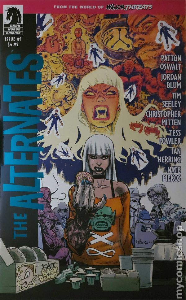 Written by Patton Oswalt; Tim Seeley; Jordan Blum. Art by Christopher Mitten. Cover by Tim Seeley. Spinning out of the world of the hit Minor Threats superhero series by Patton Oswalt, Jordan Blum, and Scott Hepburn comes a new tale of costumed underdogs—featuring a support group for superheroes, struggling to reclaim their mediocre lives after tasting their true potential. Mary the Multi-Monster! The Tripper! Crab Louie! Kid Curious! Persona! Formerly the offbeat b-list superheroes, The Alternates, who seemingly sacrificed themselves to stop an invasion from another dimension. Instead they were transported to a mirror reality where they lived complex lives in a more four-dimensional existence--expanding both their powers and consciousness. Five years later they've returned to Twilight City, struggling to reacclimate to their old lives in a traditional two-dimensional superhero world--in withdrawal from the vivid ones they left behind. When elements from this alternate reality turn up as a dangerous new street drug, some of the heroes band together to destroy it, while others succumb to its temptation. Co-written by Hack/Slashs Tim Seeley and featuring artwork by Christopher Mitten (Hellboy) and Tess Fowler (Kid Lobotomy)! 32 pages, full color. Cover price $4.99.