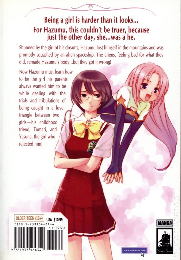 Volume 1 - 1st printing. Written by Satoru Akahori. Art by Yukimaru Katsura, and Sukune Inugami. Being a girl is harder than it looks…and for Hazumu, this couldnt be truer, because just the other day, she…was a he! Shunned by the girl of his dreams, Hazumu loses himself in the mountains and is promptly squashed by an oncoming space ship. The alien inside, feeling guilty, rebuilds Hazumus body…but as the wrong gender! Now Hazumu must learn how to be the girl his parents always wanted while dealing with the trials and tribulations of being caught in a love triangle between two girls–his childhood friend, Tomari, and Yasuna, the girl who rejected him but is now strangely attracted to him/her! Softcover, 5-in. x 7 1/2-in., 192 pages, B&W. Mature readers. Cover price $10.99.