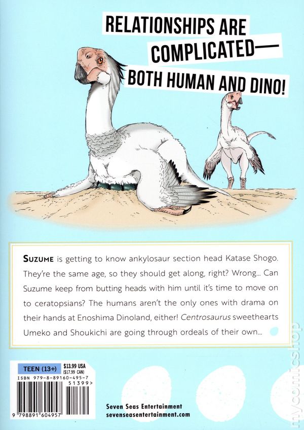 Volume 3 - 1st printing. Story and art by Itaru Kinoshita. Research Constultant: Shin-Ichi Fujiwara. Translated by John Neal. Suma Suzume, the newest keeper at struggling Enoshima Dinoland, has reached the end of her three-month orientation period. It's time for a new challenge: working alongside each of the department heads to find her permanent place on the staff! First on the list is Igarashi Keisuke, and Suzume will learn what makes him tick as they care for the park's pachycephalosaurs and stegosaurs. Softcover, 5-in. x 7-in., 204 pages, B&W. Teen Cover price $13.99.
