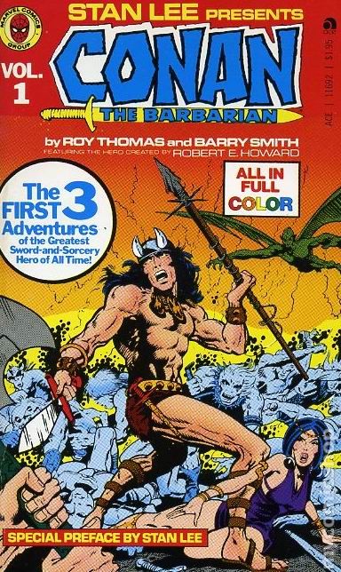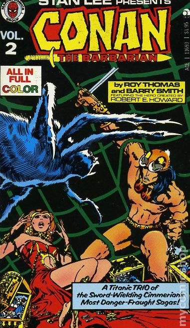 Volume 1 - 1st printing. Collects Conan the Barbarian (1970-1993 Marvel) #1-3. Written by Roy Thomas. Art by Barry Windsor-Smith, Sal Buscema and Dan Adkins. Includes - "The Coming of Conan," "Lair of the Beast-Men," and "The Twilight of the Grim Grey God!" Softcover, 4-in. x 7-in., 160 pages, full color. Cover price $1.95.