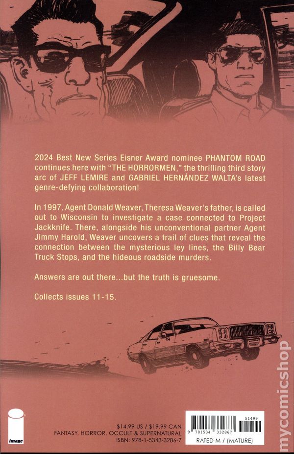 Volume 3 - 1st printing. Collects Phantom Road (2023 Image) #11-15. Written by Jeff Lemire. Art by Gabriel Hernandez Walta, Jordie Bellaire, Steve Wands. Cover by Gabriel Hernandez Walta. In 1997, Theresa Weaver's father, Agent Donald Weaver, was called out to Wisconsin to investigate a case connected to Project Jackknife. Partnered with the unconventional Agent Jimmy Harold, Weaver discovers a trail of clues that uncover the connections between the mysterious leylines, the Billy Bear truck stops, and the hideous roadside murders. Answers are out there... but the truth is gruesome. Nominated for "Best New Series" at the 2024 Eisners, PHANTOM ROAD continues in the third volume titled "THE HORRORMEN," a thrilling new story by JEFF LEMIRE and GABRIEL HERNÁNDEZ WALTA!!! Softcover, 124 pages, full color. Mature Readers Cover price $14.99.