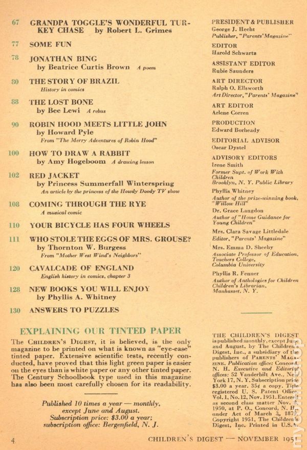 Cover by Gustaf Tenggren. A digest of fiction, fact and comics for children from the producers of Parents Magazine. "The Emperor's Nightingale" by Hans Christian Andersen; "Jonathan Bing" by Beatrice Curtis Brown; "The Wonderful Turkey Chase" by Robert L. Grimes; plus other stories, poems, comics, puzzles, games, jokes, and riddles. 5 1/2-in. x 8-in., 132 pages, Full Color. Cover price $0.25.