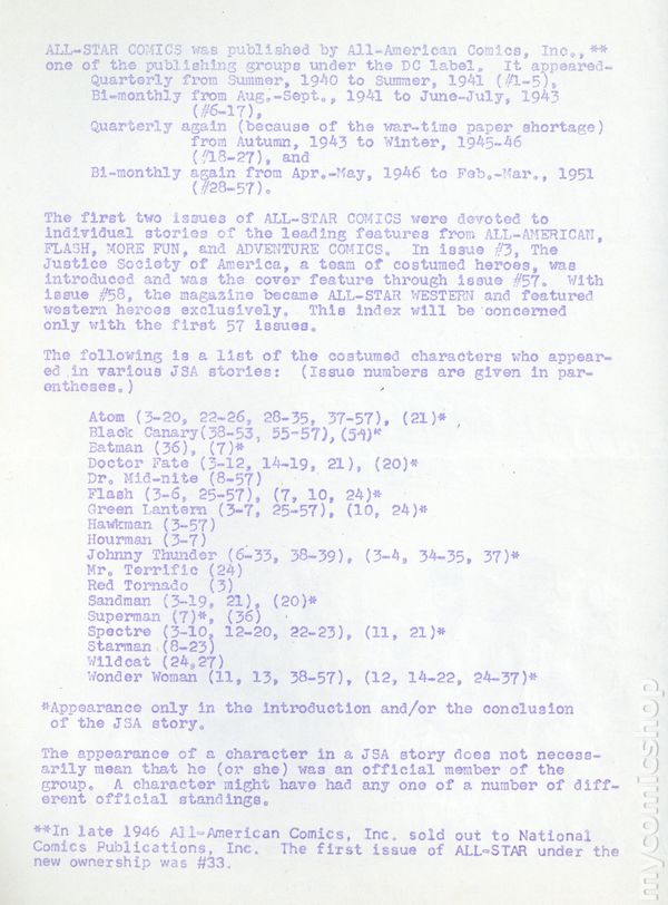 First Edition. White cover. Fan publication created by Jerry G. Bails. Indexes All Star Comics and the Justice Society of America. Corner stapled, 8-1/2" x 11", 16 pages, B&W.