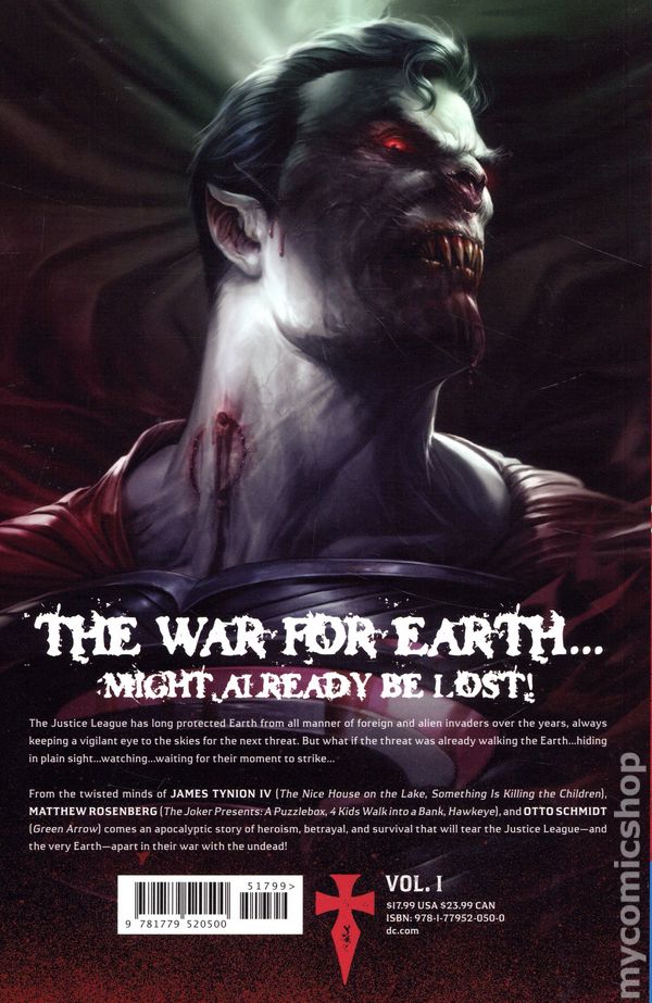 Volume 1 - 2nd and later printings. Collects DC vs. Vampires (2021 DC) #1-6. Written by James Tynion IV and Matthew Rosenberg. Art by Otto Schmidt, Simone Di Meo, and Daniel Di Niguolo. Cover by Otto Schmidt. Back Cover by Francesco Mattina. The Justice League has long protected Earth from all manner of alien invaders over the years, always keeping a vigilant eye to the skies for the next threat. But what if the threat was already walking the Earth…hiding in plain sight…watching…waiting for their moment to strike… In the tradition of DCeased comes a terrifying new series that begins from the twisted minds of James Tynion IV (The Nice House on the Lake, Something Is Killing the Children), Matthew Rosenberg (The Joker Presents: A Puzzlebox, 4 Kids Walk into a Bank, Hawkeye), and Otto Schmidt (Green Arrow) that will tear the Justice League apart in their war with the undead! Softcover, 160 pages, full color. Cover price $17.99.