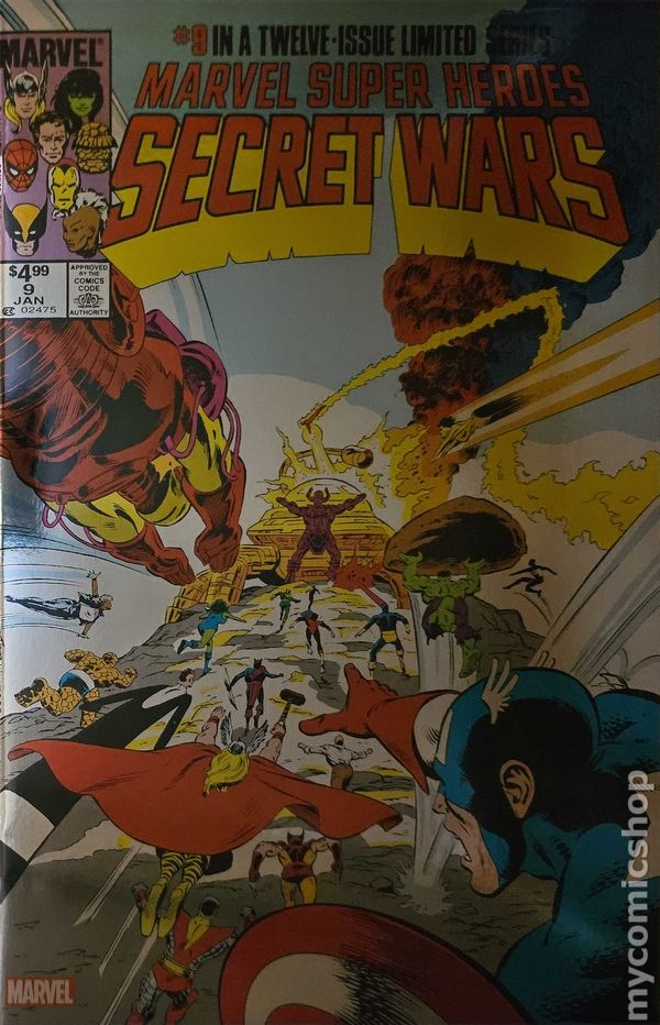 Foil Cover. Written by Jim Shooter. Art by Mike Zeck. Cover by Mike Zeck Marvel's monthly celebration of the finest super-hero crossover of them all continues with Battleworld about to be consumed by Galactus! Spider-Man is back in action and learning all the fresh tricks at his disposal courtesy of his new black costume - but his excitement might be short-lived as the assembled heroes, reunited with the X-Men, must mount an assault on the World-Eater with everything at stake! But is stopping Galactus even the right thing to do? Reed Richards isn't certain - and if he doesn't know what to do, what chance does anyone have? It's one of the all-time great Marvel comic books, boldly re-presented in its original form, ads and all! Reprinting MARVEL SUPER HEROES SECRET WARS #9. 32 pages, full color. Rated T+ Cover price $4.99.