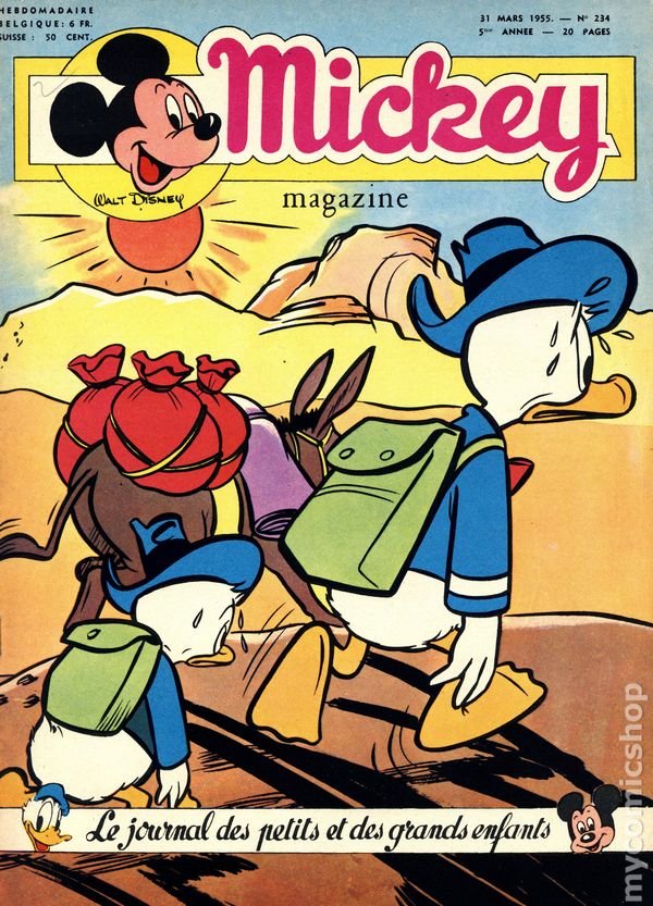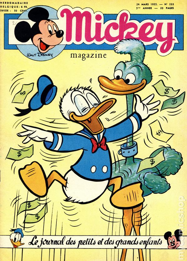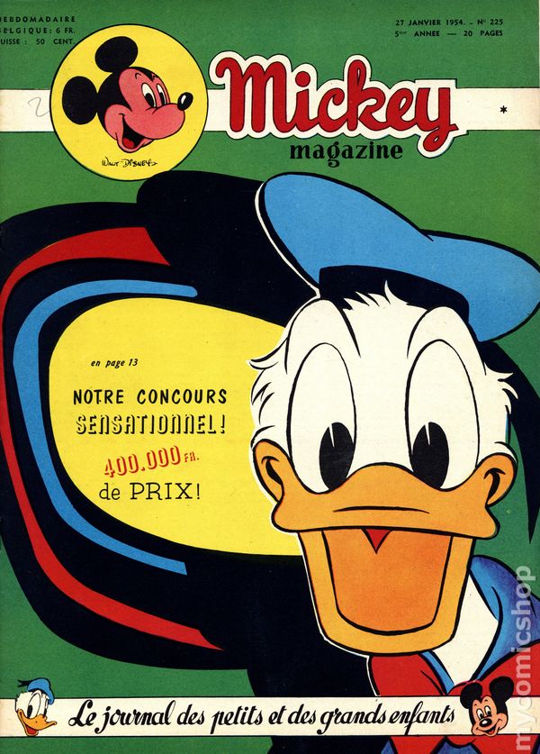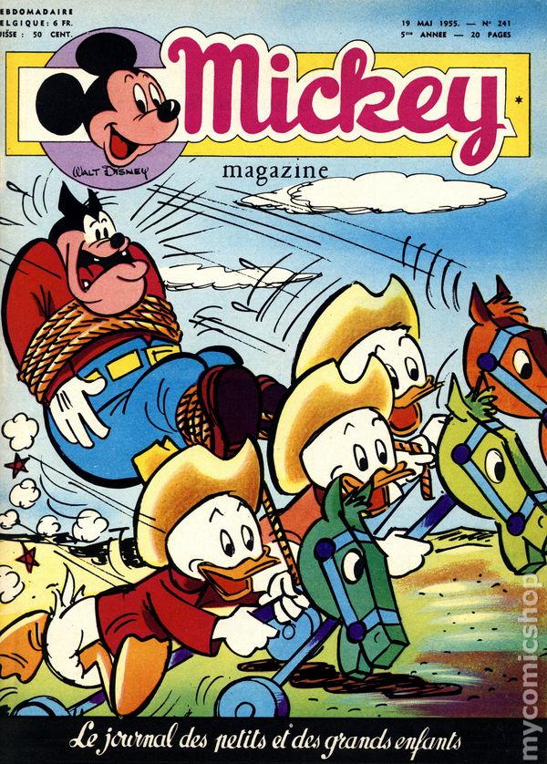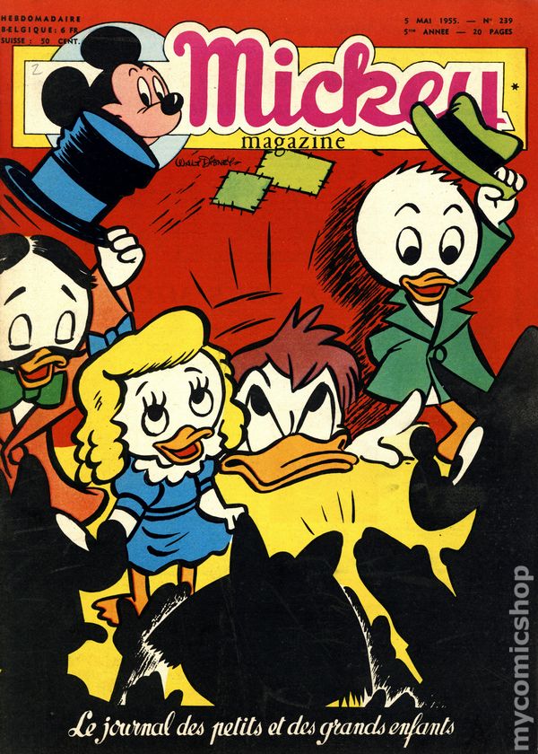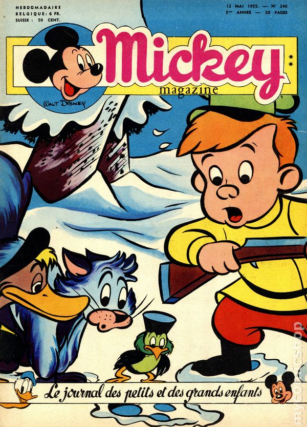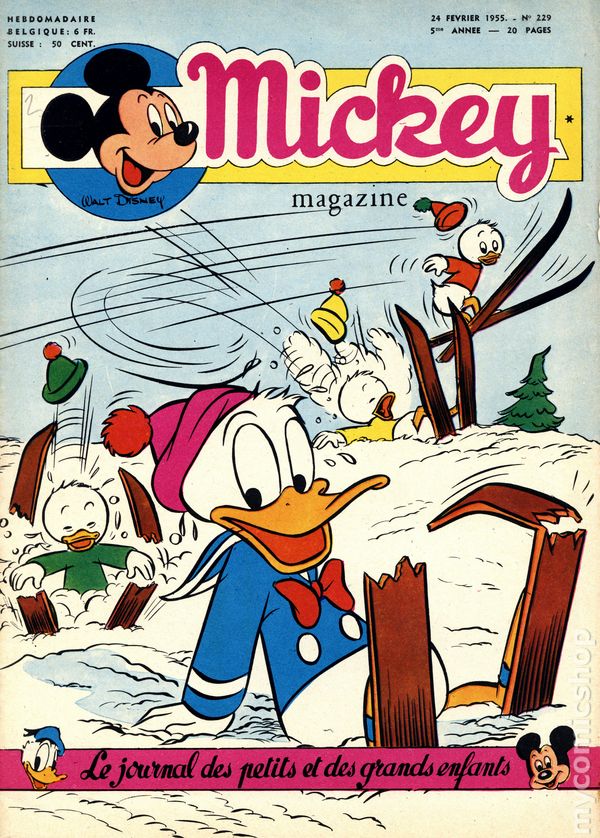 Published from 1950-1959, this Belgian publication reprinted various Disney comics and strips in a magazine-sized format with half the pages in color and half in black and white on newsprint pages. Each issue had 20 pages. In addition to comic stories, issues featured puzzles, editorials, and letters columns. The stories, including ones by Carl Barks, were serialized and often printed one page per issue, but each issue ended with one complete story. As a result, many stories were resized to five or six lines per page. French Language
