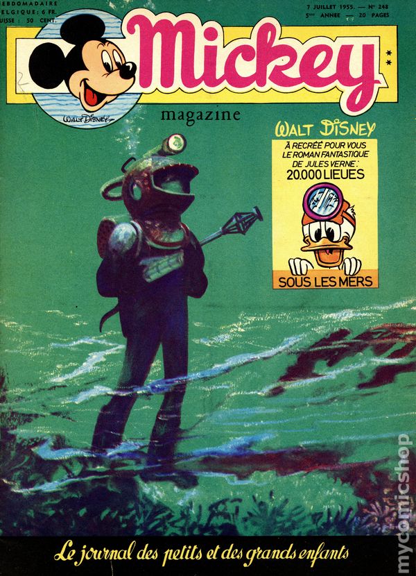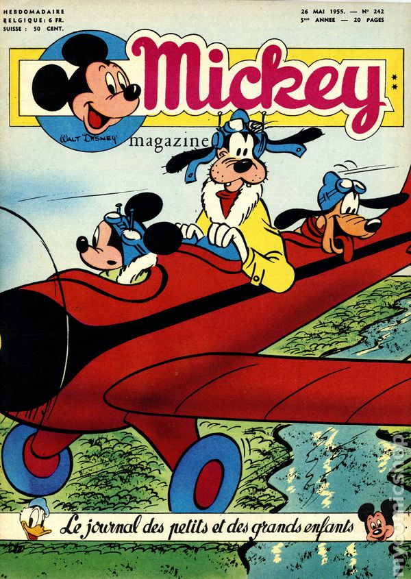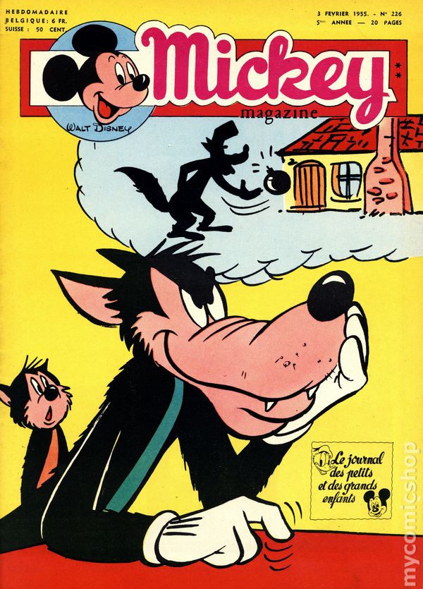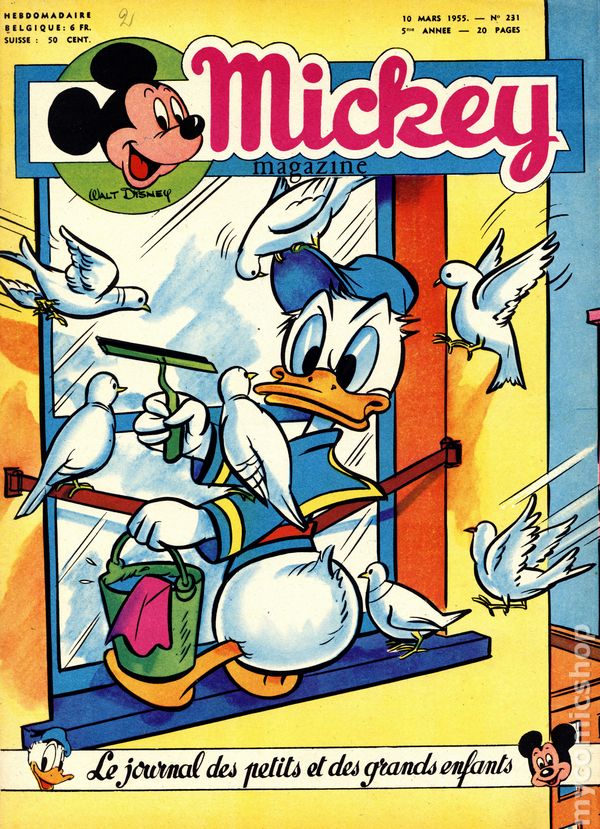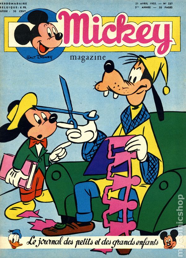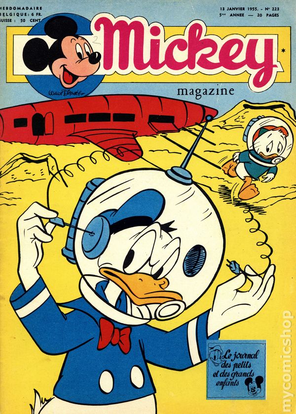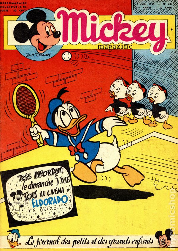 Published from 1950-1959, this Belgian publication reprinted various Disney comics and strips in a magazine-sized format with half the pages in color and half in black and white on newsprint pages. Each issue had 20 pages. In addition to comic stories, issues featured puzzles, editorials, and letters columns. The stories, including ones by Carl Barks, were serialized and often printed one page per issue, but each issue ended with one complete story. As a result, many stories were resized to five or six lines per page. French Language
