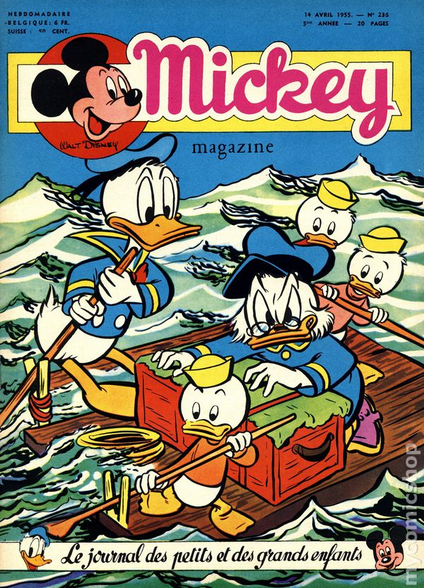 Published from 1950-1959, this Belgian publication reprinted various Disney comics and strips in a magazine-sized format with half the pages in color and half in black and white on newsprint pages. Each issue had 20 pages. In addition to comic stories, issues featured puzzles, editorials, and letters columns. The stories, including ones by Carl Barks, were serialized and often printed one page per issue, but each issue ended with one complete story. As a result, many stories were resized to five or six lines per page. French Language.