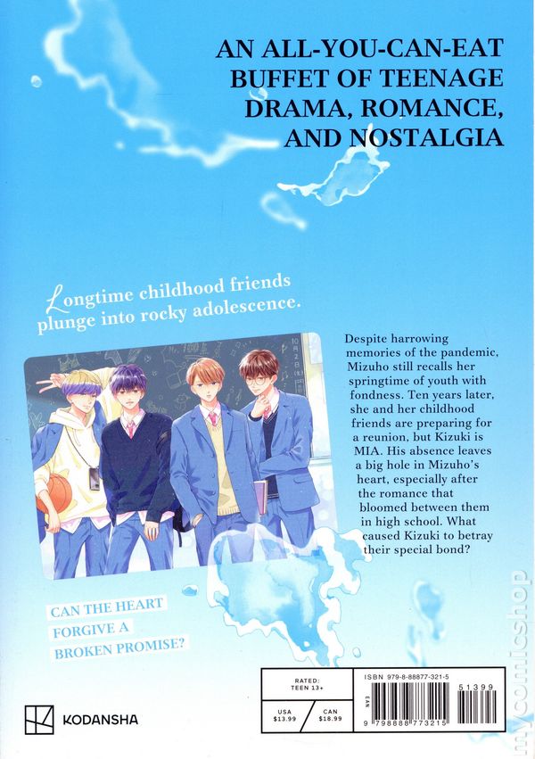 Volume 7 - 1st printing. Story and art by Haruka Mitsui. Translated by Melissa Chiam/amimaru. An irresistible shojo manga offering an all-you-can-eat-buffet of high school drama, adolescent crushes, and childhood nostalgia. Guaranteed to delight fans of popular romance comics like Komi Cant Communicate and Skip and Loafer. Despite harrowing memories of the pandemic, Mizuho still recalls her springtime of youth with fondness. Ten years later, she and her childhood friends are preparing for a reunion, but Kizuki is MIA. His absence leaves a big hole in Mizuhos heart, especially after the romance that bloomed between them in high school. What caused Kizuki to betray their special bond? Can the heart forgive a broken promise? Longtime childhood friends plunge into rocky adolescence. An all-you-can-eat buffet of teenage drama, romance, and nostalgia. Softcover, 5-in. x 7-in., 160 pages, B&W. Cover price $13.99.
