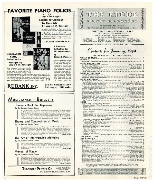 Etude (1883-1957 Theodore Presser) Vol. 62 #1Published Jan 1944 by Theodore Presser.$20.00