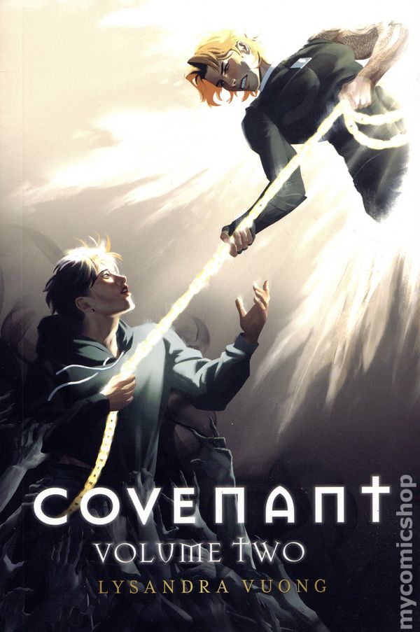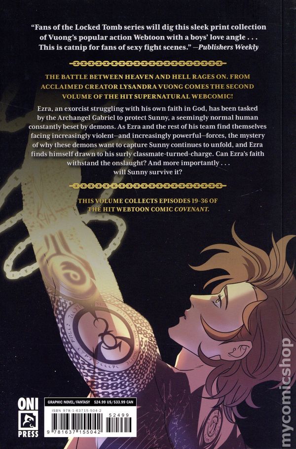 Volume 2 - 1st printing. Story and art by LySandra Vuong. The battle between Heaven and Hell rages on-with Ezra and Sunny caught in the middle! From acclaimed creator LySandra Vuong comes the second volume of the supernatural webcomic that explores a slow burn queer romance, religious faith, the weight of destiny, and what it means to be good in a world plagued by demons. In a world where priests are decked out in holy tattoos and brandish machine guns in the face of demons, Sunny Nguyen is an outlier-a seemingly normal human who is a mysterious demon magnet. Ezra, an exorcist struggling with his own faith in God, has been tasked by the Archangel Gabriel to protect Sunny-but that might be easier said than done. As Ezra and the rest of those on his team find themselves facing increasingly violent-and increasingly powerful-forces, the mystery of why these demons want to capture Sunny continues to unfold, and Ezra finds himself drawn to his surly classmate-turned-charge. With their friendship growing and danger mounting, can Ezra's faith withstand the onslaught? And more importantly-will Sunny survive it? This volume collects episodes 19-36 of the hit Webtoon series Covenant! Softcover, 248 pages, full color. Cover price $24.99.
