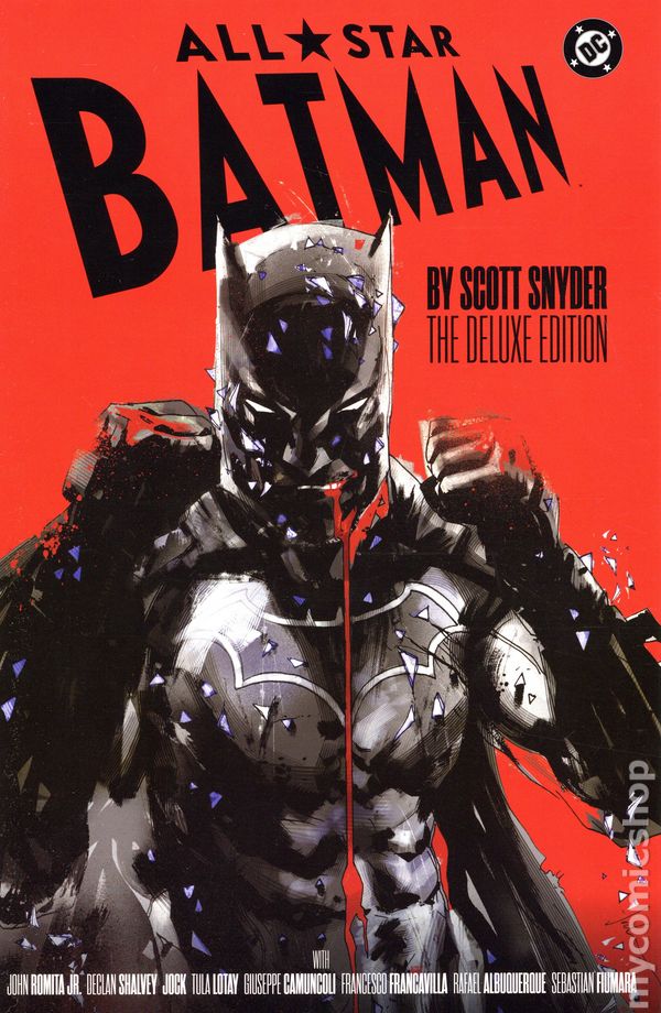 2nd and later printings. Collects All Star Batman (2016) #1-14. Written by Scott Snyder, Rafael Albuquerque, and Rafael Scavone. Art by John Romita, Jr., Declan Shalvey, Jock, Tula Lotay, Francesco Francavilla, Giuseppe Camuncoli, Rafael Albuquerque, Sebastian Fiumara, Danny Miki, Mark Morales, Tom Palmer, Sandra Hope, and Richard Friend. Cover by Jock. Back Cover by John Romita and Danny Miki. Award-winning writer Scott Snyder teams up with all-star artists John Romita Jr., Declan Shalvey, Jock, Tula Lotay, Francesco Francavilla, Giuseppe Camuncoli, Rafael Albuquerque, and Sebastian Fiumara in this deluxe hardcover of the acclaimed DC Rebirth series! Featuring iconic showdowns between the Dark Knight and villains such as Two-Face, Mr. Freeze, Poison Ivy, KGBeast, the Penguin, and more, the stories showcased in this volume highlight why the Caped Crusader is one of the most iconic characters in comics. All-Star Batman by Scott Snyder: The Deluxe Edition collects the entire 14-issue series and includes an extensive variant cover gallery and behind-the-scenes art from the illustrators who contributed to the series. Hardcover, 584 pages, full color. Rated T Cover price $49.99.