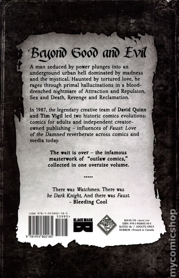 1st printing. Written by David Quinn. Art by Tim Vigil. Cover by Jason Moore. Essay by Klint Finley. Because YOU demanded it, FAUST IS BACK! The legendary 'outlaw comic' that shocked a generation is finally collected in a complete paperback edition for the first time ever, following its hardcover edition that sold out in its first day of release! A man seduced by power plunges into an underground urban hell dominated by madness and the mystical. Haunted by tortured love, he rages through primal hallucinations in a blood-drenched nightmare of Attraction and Repulsion, Sex and Death, Revenge and Reclamation. Collects the original 15-issue 'outlaw comic' in one outrageous tome - now available for the first time in a trade paperback edition, a "grail" acquisition for every comics / dark fantasy library! Softcover, 500 pages, PC. Mature Readers NOTE: "The legend of the Ramones was that every town they played in spawned numerous bands the next day. Faust comics are my Ramones." --ED PISKOR (Red Room, X-Men Grand Design, Cartoonist Kayfabe) Cover price $59.95.