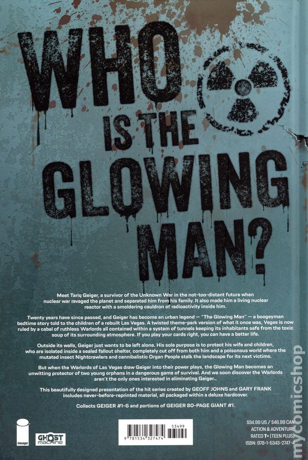 Volume 1 - 2nd and later printings. Collects Geiger (2021 Image) #1-6 and material from Geiger 80-Page Giant (2021 Image). Written by Geoff Johns. Art and cover by Gary Frank. THE UNNAMED universe starts here! Set 25 years from now, a nuclear war has ravaged the planet, and desperate outlaws battle for survival in a world of radioactive chaos. Out past the poisoned wasteland lives a man even the Nightcrawlers and Organ People fear. His name is Tariq Geiger, whose body has transformed into a living nuclear reactor waiting to explode. And he will do anything to protect his wife and children, sealed inside a fallout shelter and completely cut off from him. But the Warlords of Vegas want Geiger dead, and if his family must be released into the toxic soup, so be it. By the critically acclaimed team of writer GEOFF JOHNS, artist GARY FRANK, colorist BRAD ANDERSON (Doomsday Clock, Batman Earth One), and letterer ROB LEIGH. Includes over 30 pages of bonus material! Hardcover, 272 pages, full color. Rated T+ Cover price $34.99.
