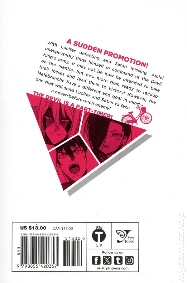 Volume 23 - 1st printing. Written by Satoshi Wagahara. Art and cover by 029 (Oniku). Translated by Kevin Gifford. Now that Lucifer has defected and Satan is missing, things are looking grim for the Devil King's Army. But in an unexpected twist of events, Alciel is appointed as the next supreme commander! From enemy to reluctant ally to leader, how will the new leader command them to triumph!? Softcover, 5-in. x 7-in., 192 pages, B&W. Teen Cover price $13.00.
