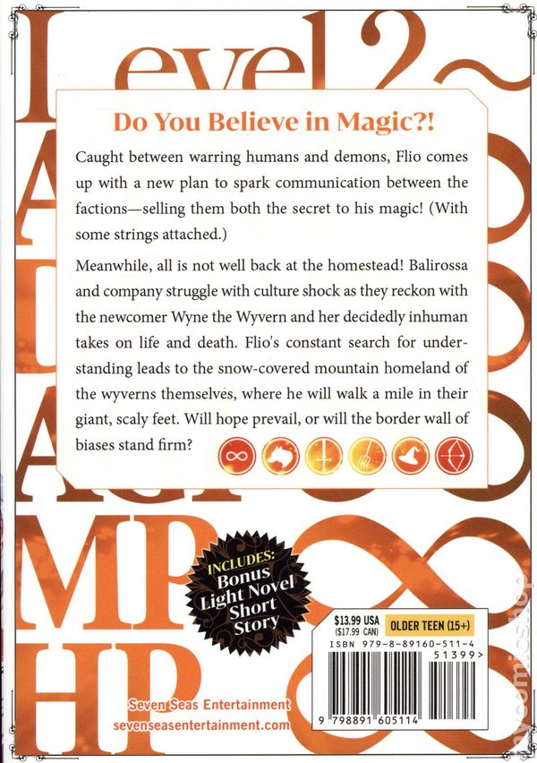 Volume 9 - 1st printing. Written by Miya Kinojo. Art and cover by Akine Itomachi. Character Design by Katagiri. Translated by John Neal. Adapted by Topher Pirki. DO YOU BELIEVE IN MAGIC!? Caught between warring humans and demons, Flio comes up with a new plan to spark communication between the factions—selling them both the secret to his magic! (With some strings attached.) Meanwhile, all is not well back at the homestead! Balirossa and company struggle with culture shock as they reckon with the newcomer Wyne the Wyvern and her decidedly inhuman takes on life and death. Flios constant search for understanding leads to the snow-covered mountain homeland of the wyverns themselves, where he will walk a mile in their giant, scaly feet. Will hope prevail, or will the border wall of biases stand firm?! Softcover, 5-in. x 7-in., 172 pages, B&W. Older Teen (15+) Cover price $12.99.