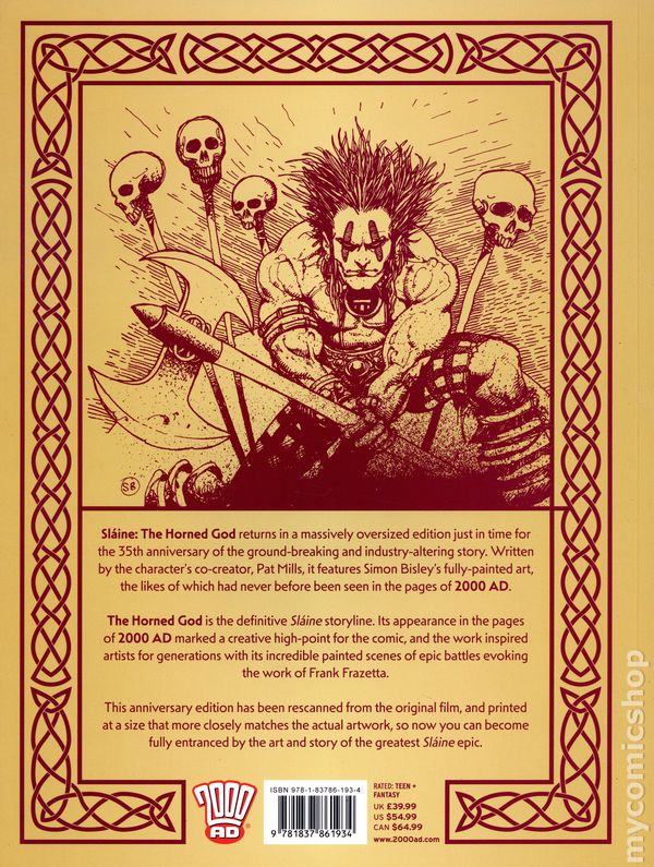 2nd and later printings. Written by Pat Mills. Art and cover by Simon Bisley. Sláine: The Horned God returns to print in a massively oversized edition just in time for the 35th anniversary of the ground-breaking and industry-altering story. Written by the character's co-creator, Pat Mills, and featuring fully-painted art the likes of which had never before been seen in the pages of 2000 AD. The Horned God is the definitive Sláine storyline. This anniversary edition has been rescanned from the original film, and printed at a size that more closely matches the actual artwork, so now you can become fully entranced by the art and story of the greatest Sláine epic. Softcover, 10-in. x 14-in., 208 pages, full color. Cover price $54.99.