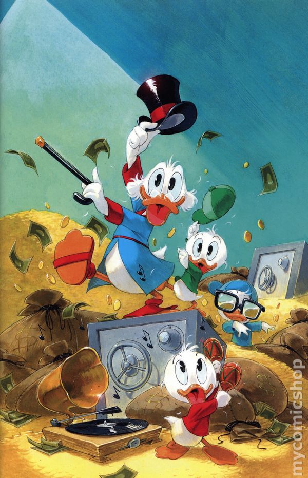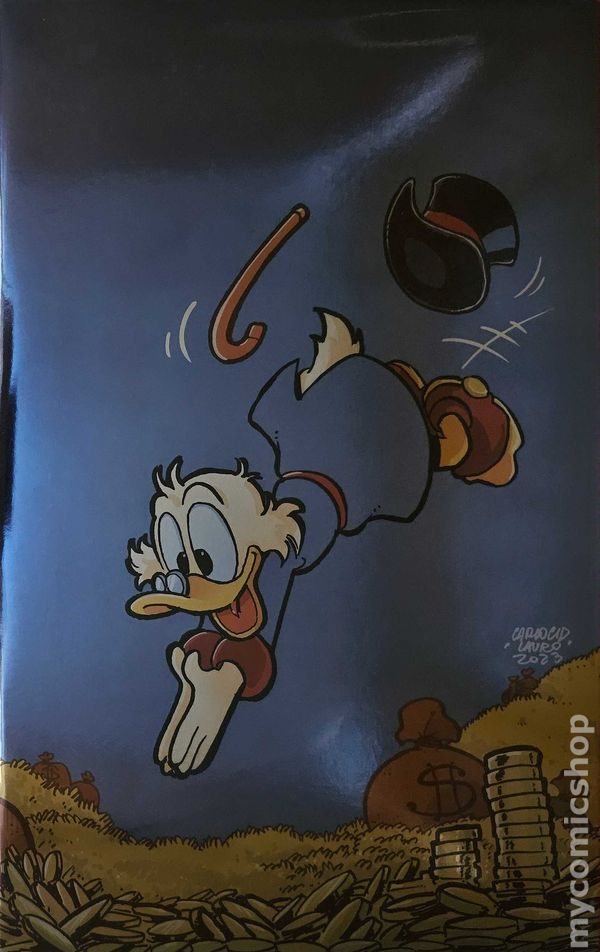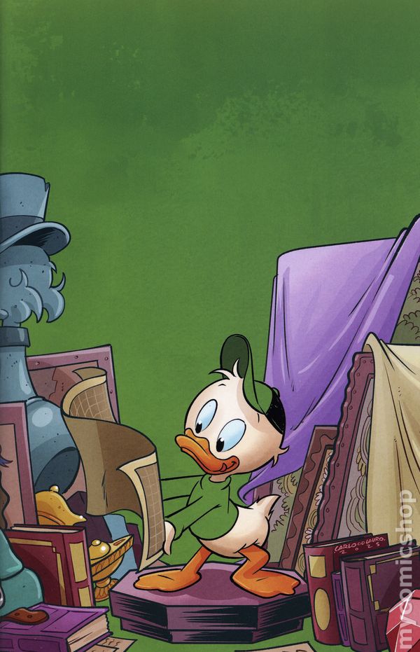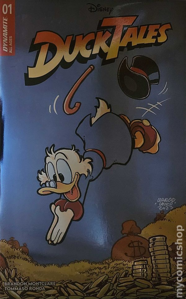Limited 1 for 50 Retailer Incentive Variant Cover. Written by Brandon Montclare. Art by Tommaso Ronda. Cover by Carlo Lauro. The ridiculously wealthy Scrooge McDuck is the most famous resident of Duckburg-but his fortune goes far beyond mere currency. To his young nephews, 'Unca' Scrooge is rich in something even more important than money stories! Whether it's the saga of how he dug his first million out of the Klondike, or the many times he saved his lucky Number One Dime from the clutches of Magica De Spell, the feisty tycoon is a font of mesmerizing tales and Huey, Dewey, and Louie can't get enough! But even as they pester their Uncle to share more yarns of his legendary quests and globetrotting treasure hunts, the three boys are about to learn that the most valuable item Scrooge McDuck owns isn't locked up in his absurdly capacious Money Bin -it's the lifetime of wisdom he's got stockpiled inside his head! Writer BRANDON MONTCLARE (Moon Girl and Devil Dinosaur, Rocket Girl) and artist TOMMASO RONDA (Kalya) uncover a vein of solid gold adventures with Duck Tales #1 burnished by billion-dollar covers from IVAN BIGARELLA, FRANCESCO TOMASELLI, CARLO LAURO, and ALAN QUAH! 32 pages, full color. Cover price $4.99.