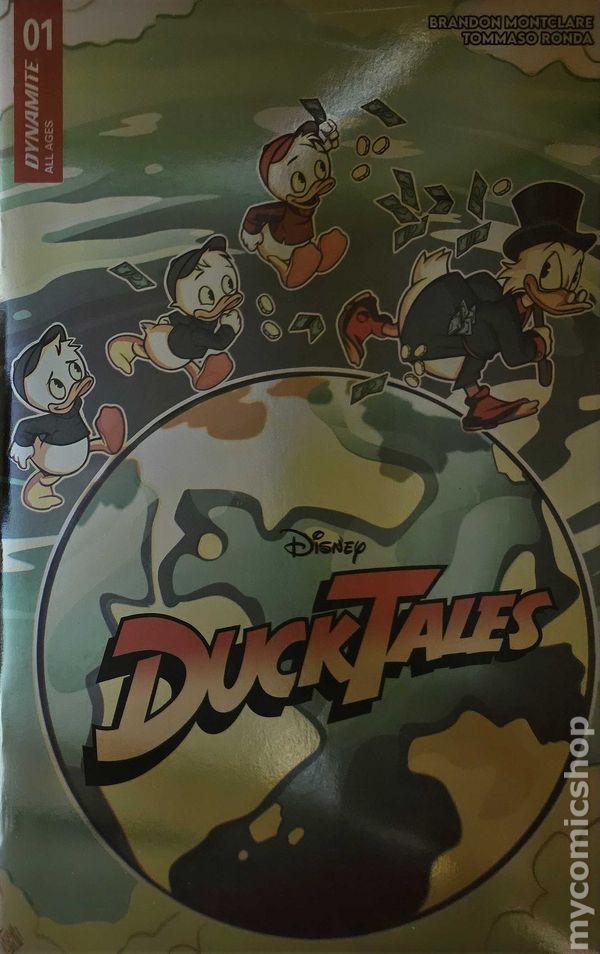 Classic Character Cover. Written by Brandon Montclare. Art by Tommaso Ronda. The ridiculously wealthy Scrooge McDuck is the most famous resident of Duckburg-but his fortune goes far beyond mere currency. To his young nephews, 'Unca' Scrooge is rich in something even more important than money stories! Whether it's the saga of how he dug his first million out of the Klondike, or the many times he saved his lucky Number One Dime from the clutches of Magica De Spell, the feisty tycoon is a font of mesmerizing tales and Huey, Dewey, and Louie can't get enough! But even as they pester their Uncle to share more yarns of his legendary quests and globetrotting treasure hunts, the three boys are about to learn that the most valuable item Scrooge McDuck owns isn't locked up in his absurdly capacious Money Bin -it's the lifetime of wisdom he's got stockpiled inside his head! Writer BRANDON MONTCLARE (Moon Girl and Devil Dinosaur, Rocket Girl) and artist TOMMASO RONDA (Kalya) uncover a vein of solid gold adventures with Duck Tales #1 burnished by billion-dollar covers from IVAN BIGARELLA, FRANCESCO TOMASELLI, CARLO LAURO, and ALAN QUAH! 32 pages, full color. Cover price $4.99.