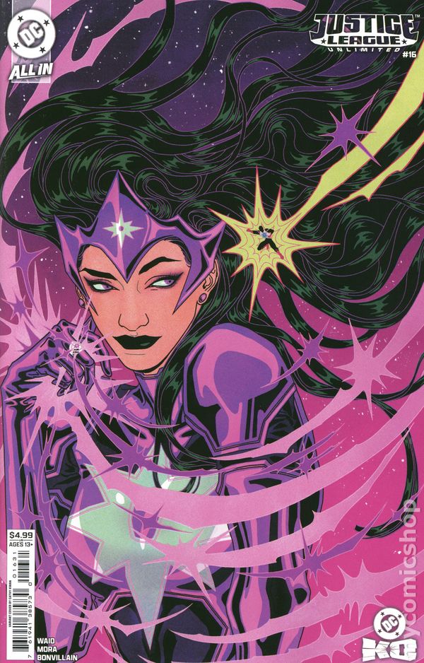 Limited 1 for 25 Retailer Incentive Variant Cover. Written by Mark Waid. Art by Dan Mora. Cover by Nimit Malavia. APOKOLIPS IS ON THE HORIZON...AND NO ONE IS SAFE! In the aftermath of the devastating events of We Are Yesterday, the Justice League is reeling from the Legion of Doom's wrathful rampage! But no time to rest for the protectors of our planet, as the secrets unlocked during their time-crossed duel have brought our heroes face-to-face with a mysterious Quantum Quorum, who has reason to fear that all of creation might soon come to an end. It's the next big step on the path of the All In saga in the epic epilogue to We Are Yesterday! 40 pages, full color. Rated T+ Cover price $4.99.
