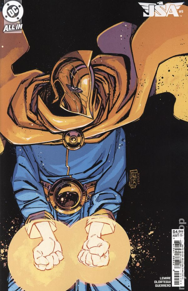 Written by Jeff Lemire. Art by Diego Olortegui. Cover by Diego Olortegui. THE NEW ERA OF THE JSA BEGINS HERE! Long-time fan favorite characters Hawkman, Hawkgirl, Jade, Obsidian, Jesse Quick, Hourman, Ted Grant, and Sandman are all back on the roster as DC's first super team faces their greatest and most personal challenge yet. Will golden age ideals hold true in a world recovering from the events of Absolute Power? Or do they need a more hardcore approach to stand a chance against the new Injustice Society of America? 28 pages, full color. Rated T+ Cover price $3.99.