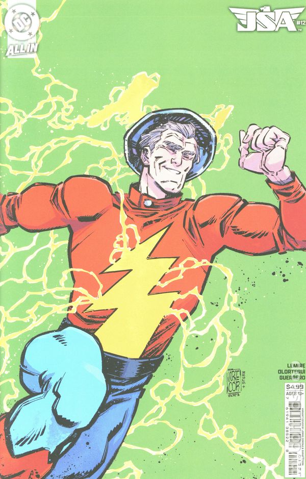 Written by Jeff Lemire. Art by Diego Olortegui. Cover by Jeff Lemire. THE NEW ERA OF THE JSA BEGINS HERE! Long-time fan favorite characters Hawkman, Hawkgirl, Jade, Obsidian, Jesse Quick, Hourman, Ted Grant, and Sandman are all back on the roster as DC's first super team faces their greatest and most personal challenge yet. Will golden age ideals hold true in a world recovering from the events of Absolute Power? Or do they need a more hardcore approach to stand a chance against the new Injustice Society of America? 32 pages, full color. Rated T+ Cover price $4.99.