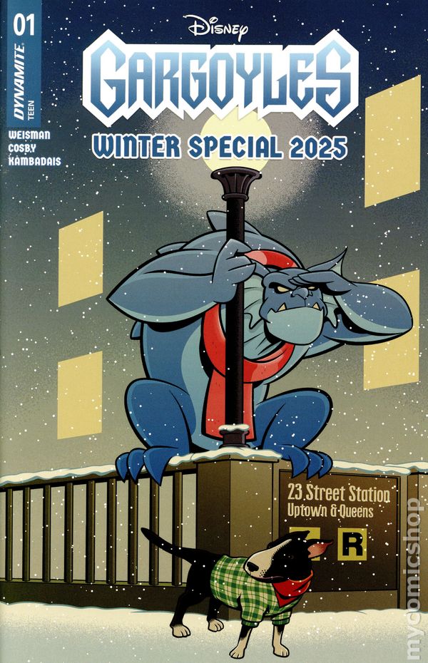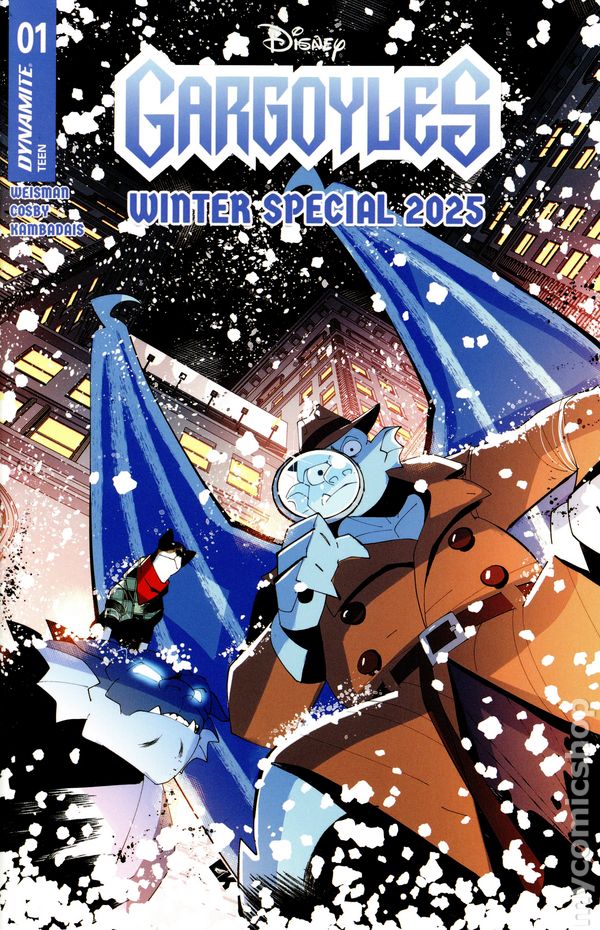 Written by Greg Weisman, Nate Cosby. Art by George Kambadais. Cover by Trish Forstner. Disney and Dynamite present a very special GARGOYLES holiday treat: 'Bronx's Silent Night!' When a December blizzard blankets New York in snow, the city that never sleeps comes to a standstill - and the Gargoyles awaken to find that Manhattan has been transformed into a silent winter wonderland! With the rest of the Clan on patrol, Bronx is eager to explore this new landscape on his own… but his peaceful night is interrupted when a family is separated and Bronx has to sniff out the missing member before they're trapped under ten feet of snow! Co-written by Gargoyles creator GREG WEISMAN and NATE COSBY, and illustrated by returning Gargoyles artist GEORGE KAMBADAIS, this all-new 40-page special will warm the hearts of even the most jaded of seasonal cynics - fortified by glowing covers from KAMBADAIS, JAE LEE & JUNE CHUNG, TRISH FORSTNER, and CHRIS ELIOPOULOS! 40 pages, full color. Rated T Cover price $5.99.