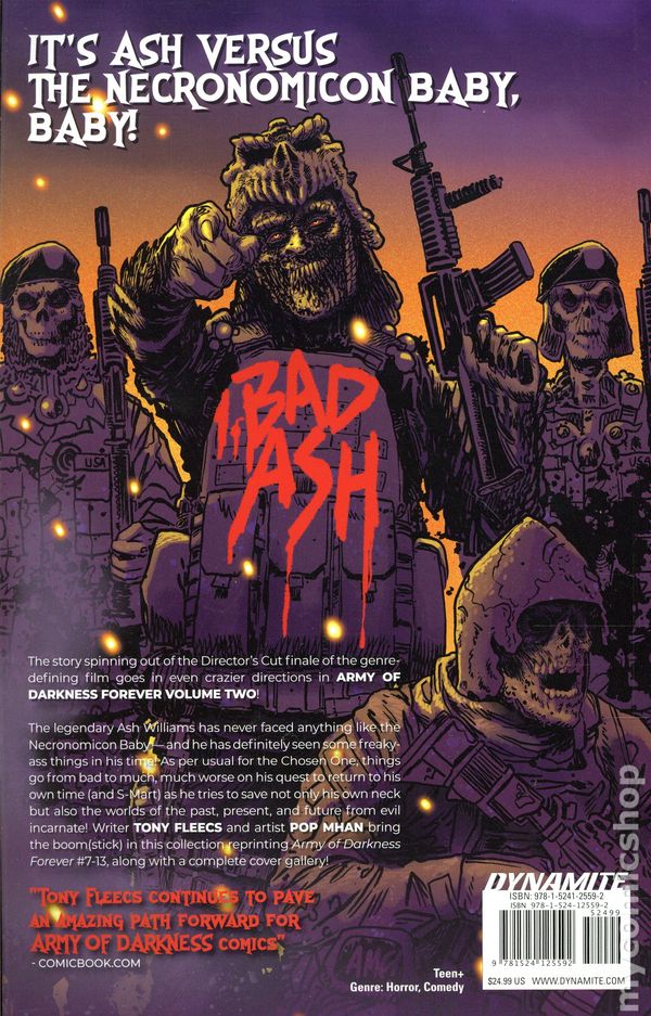 Volume 2 - 1st printing. Collects Army of Darkness: Forever (2023 Dynamite) #7-13. Written by Tony Fleecs. Art by Pop Mhan, Justin , Eamon Winkle, and Kewber BaalGreenwood. Cover by Chris Burnham. Back Cover by Tony Fleecs. HAIL TO THE PAST, PRESENT, AND FUTURE KINGS, BABY! The stakes are raised to apocalyptic levels in this second collection of the phantasmagorical new adventures of Ashley J. Williams! Trapped across three different timelines, the indefatigable Ash leads a rag-tag team of… well, himselves (plus Sheila, the Wiseman, and something called the Necronomicon Baby) on a desperate, hail-Mary attempt to destroy the Deadites, defeat multiple Necronomicons, and maybe — just maybe — save the world! Fulfilling the ancient prophecies foretold in its namesake film, Army of Darkness Forever Vol. 2 collects issues #7-13 of the hair-raising series from writer TONY FLEECS and artist POP MHAN, and includes a complete cover gallery featuring unforgettable imagery from FLEECS, BJORN BARENDS, ARTHUR SUYDAM, and CHRIS BURNHAM! Softcover, 176 pages, full color. Rated T+ Cover price $24.99.