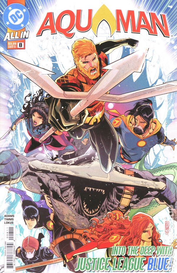Written by Jeremy Adams. Art by John Timms. Cover by Don Aguillo. REUNITED WITH THE JUSTICE LEAGUE! Aquaman has returned to Earth with new powers, new allies, and a new chance to be a father...all while a new mystery emerges from the depths of Atlantis! After the devastating events of the Battle of Dagon, Aquaman's so-called Justice League Blue must regroup and refocus their efforts on Earth...and the return of one of the King of the Seven Seas' deadliest enemies! 32 pages, full color. Rated T+ Cover price $4.99.